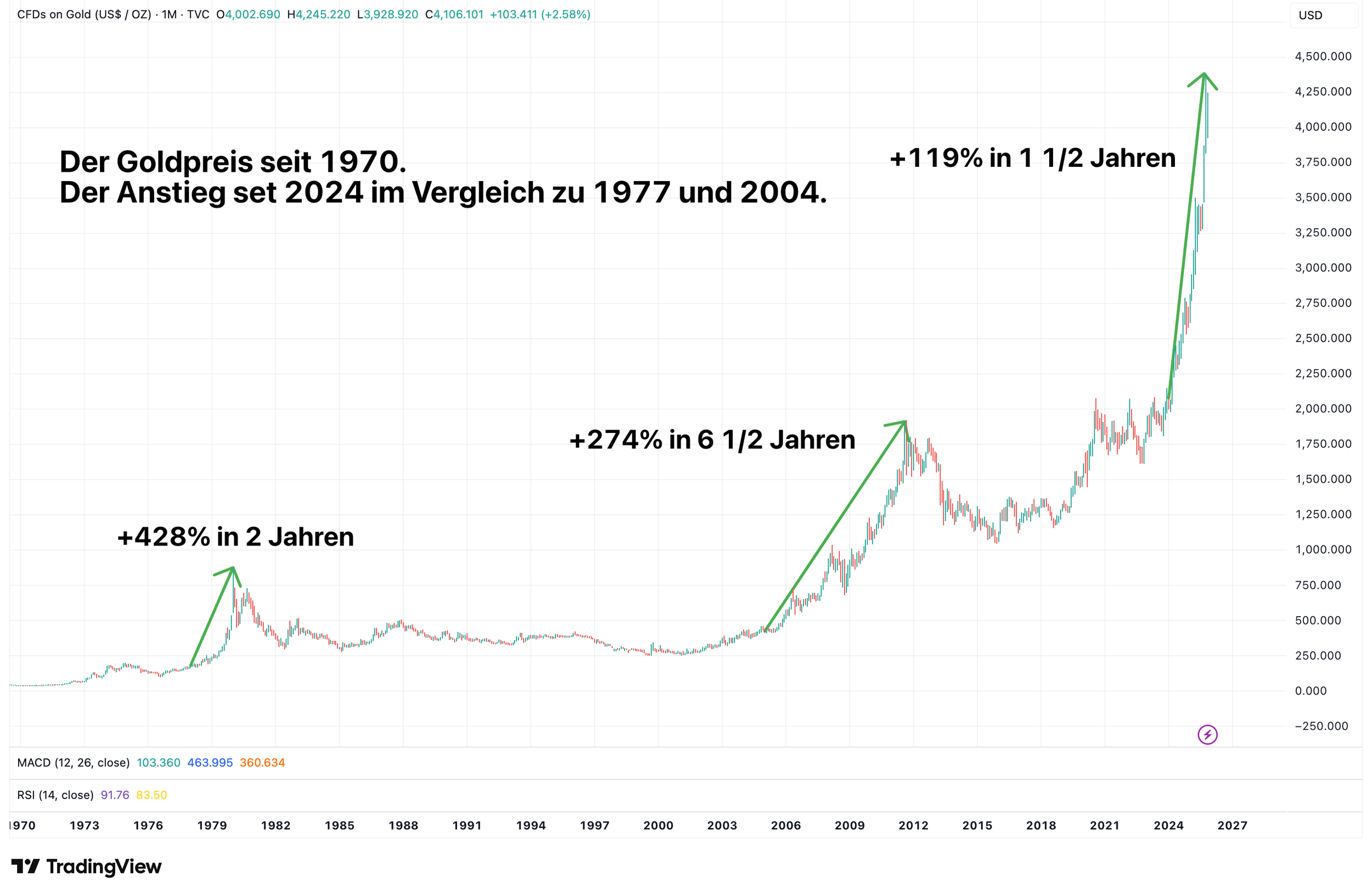 Im Vergleich zu den Anstiegen von 1977 und 2004, hat der aktuelle Anstieg des Goldpreises durchaus noch Luft nach oben. Quelle: tradingview.com