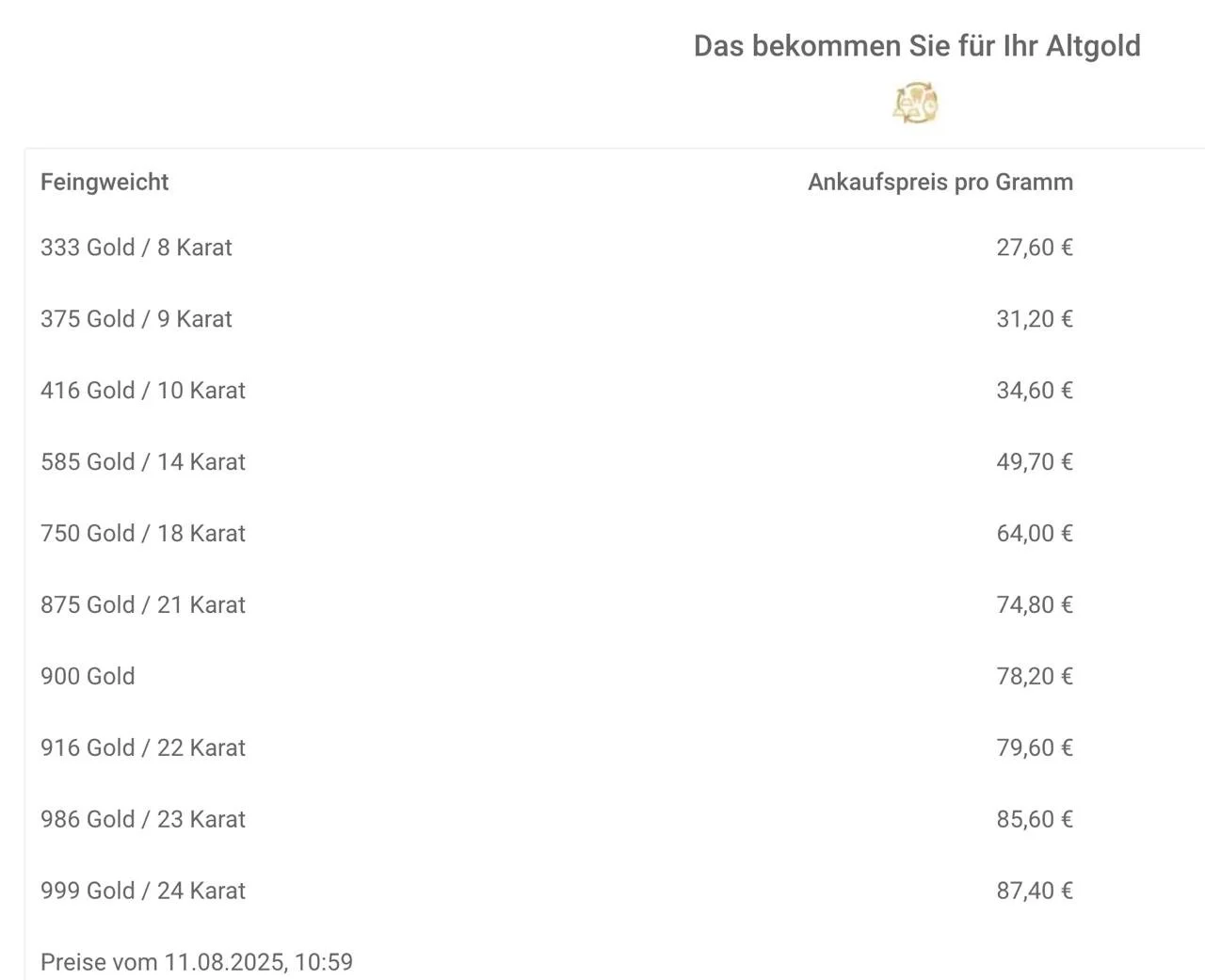 Ankaufspreise Altgold bei SOLIT vom 11.08.2025