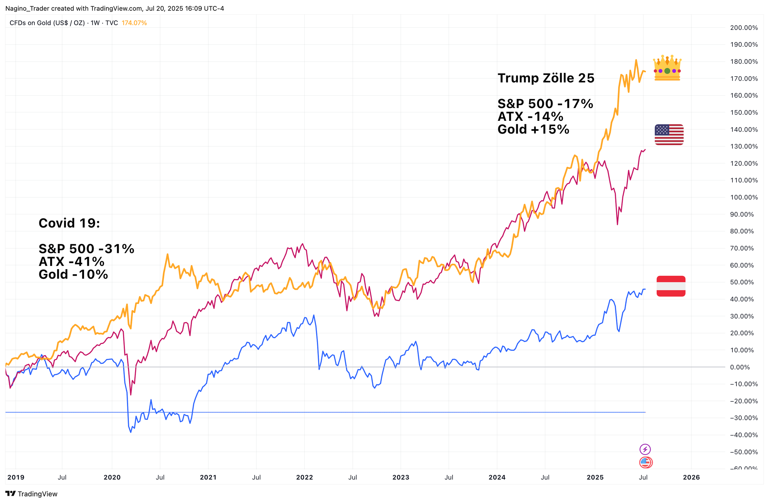 Gold musste während Corona zwar an Wert einbüßen, aber weniger als der Österreichische ATX oder der US Amerikanische S&P 500 Aktienindex. Ähnlich verlief der Zollschock von Donald Trump in 2025. Quelle: tradingview.com