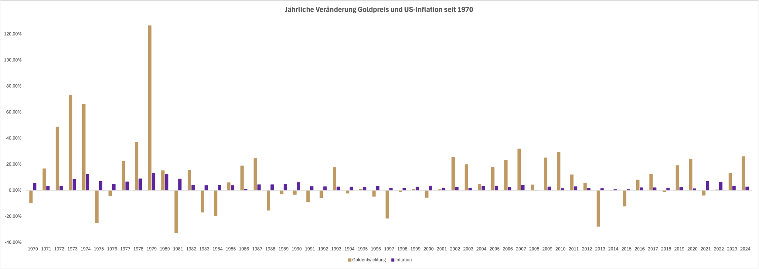 In Zeiten von höherer Inflation, steigt der Goldpreis oftmals auch. Hier sehen Sie die jährlichen Veränderungen im Goldpreis un der US-Inflation seit 1970. Quelle: NYU Stern.