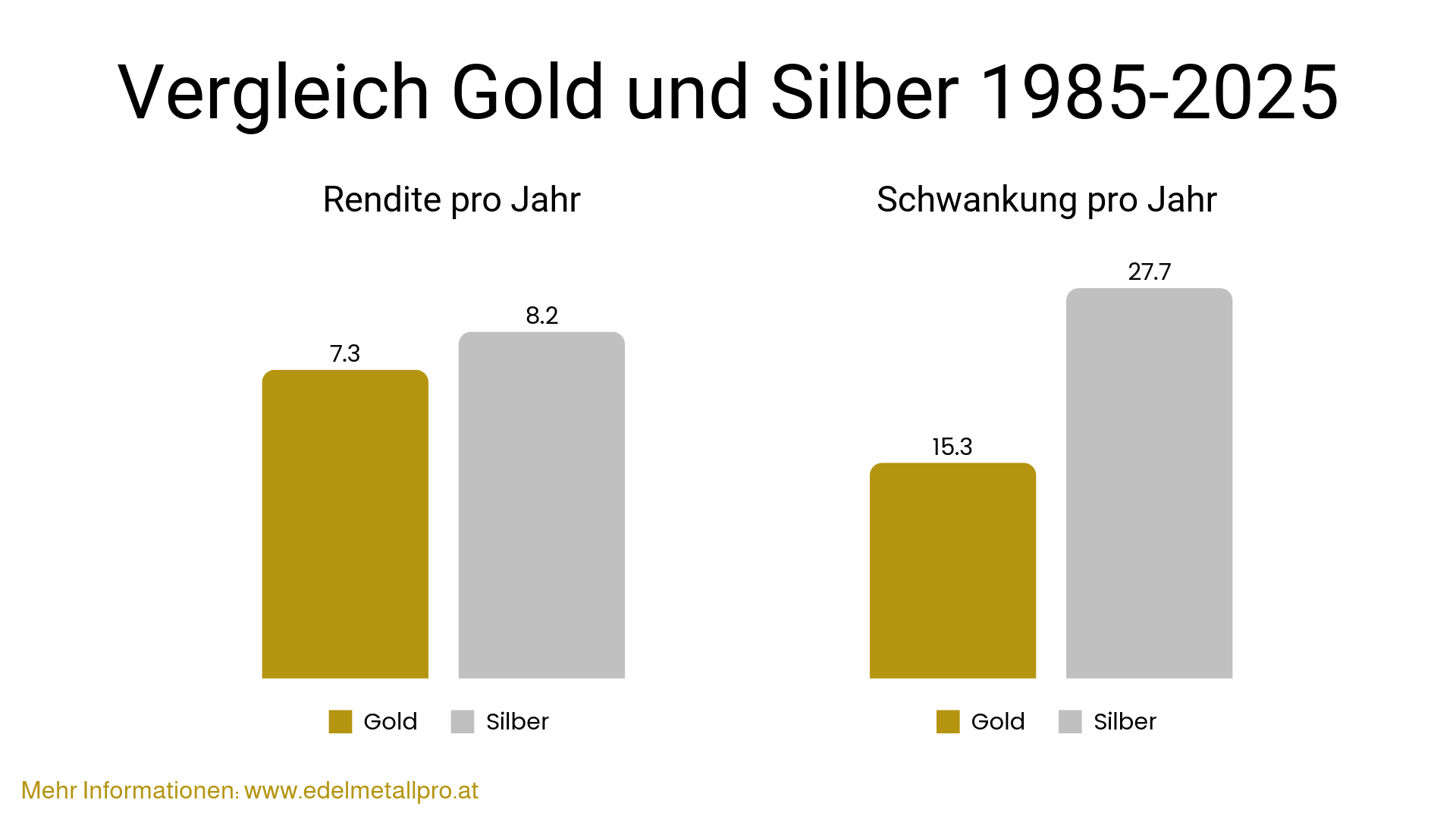 Langfristige Performance von Gold und Silber seit 1985: Höhere Stabilität bei Gold, höhere Schwankungen bei Silber.