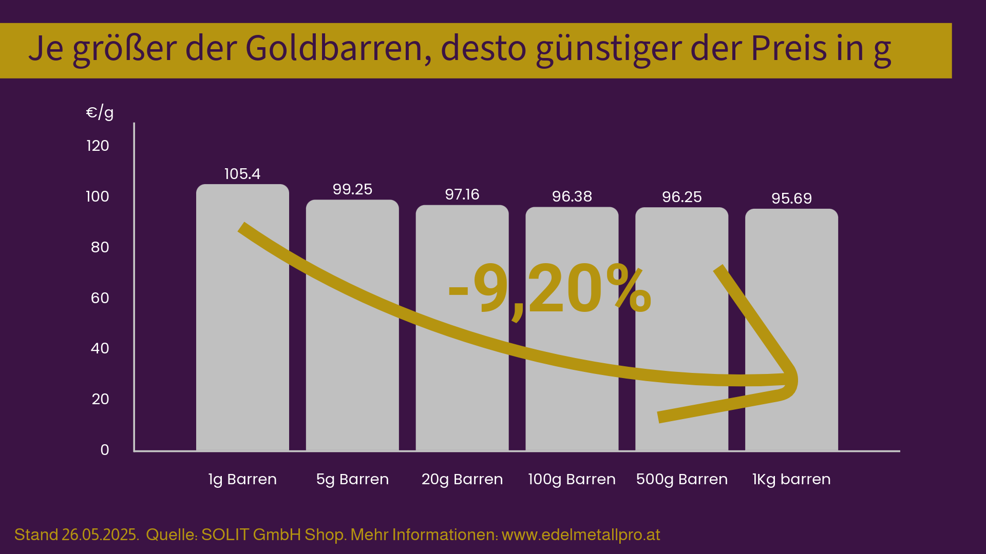 Der Preis in € pro Gramm Gold sinkt mit der Größe der Goldbarren. Je größer ein Barren, desto effizienter ist sein Preis. Das liegt daran, dass bei großen Barren die Herstellungskosten auf mehr Gold verteilt werden.