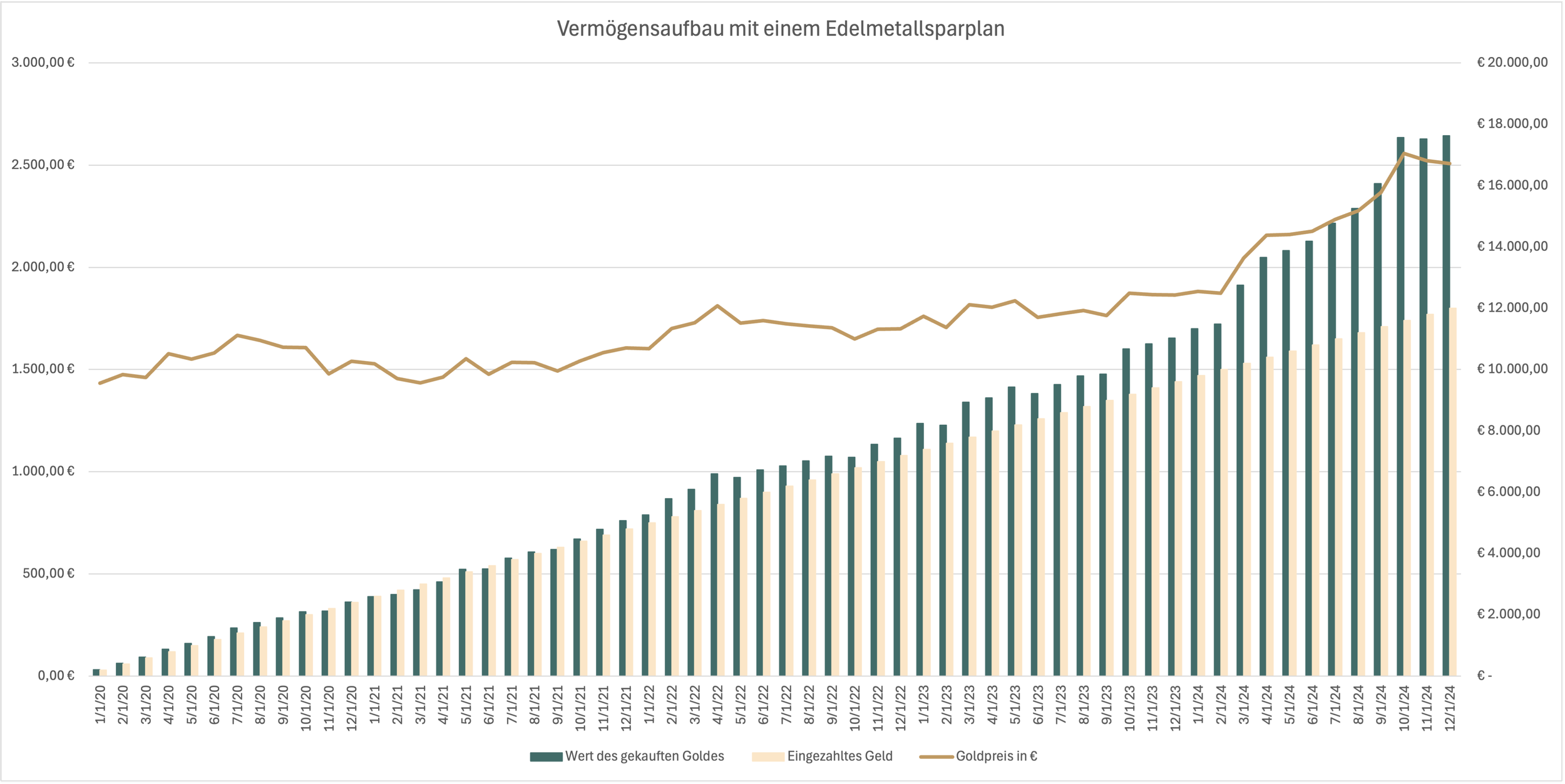 Anfangs wächst der Wert der Goldanlage ähnlich schnell wie die Einzahlungen, denn der Goldpreis bewegt sich seitwärts - ideal um günstig einzukaufen! Doch irgendwann steigt der Wert Ihres Vermögens dank schneller steigenden Goldpreis rasant. Aus eingezahlten 12.000€ sind hier mehr als 17.000€ geworden.