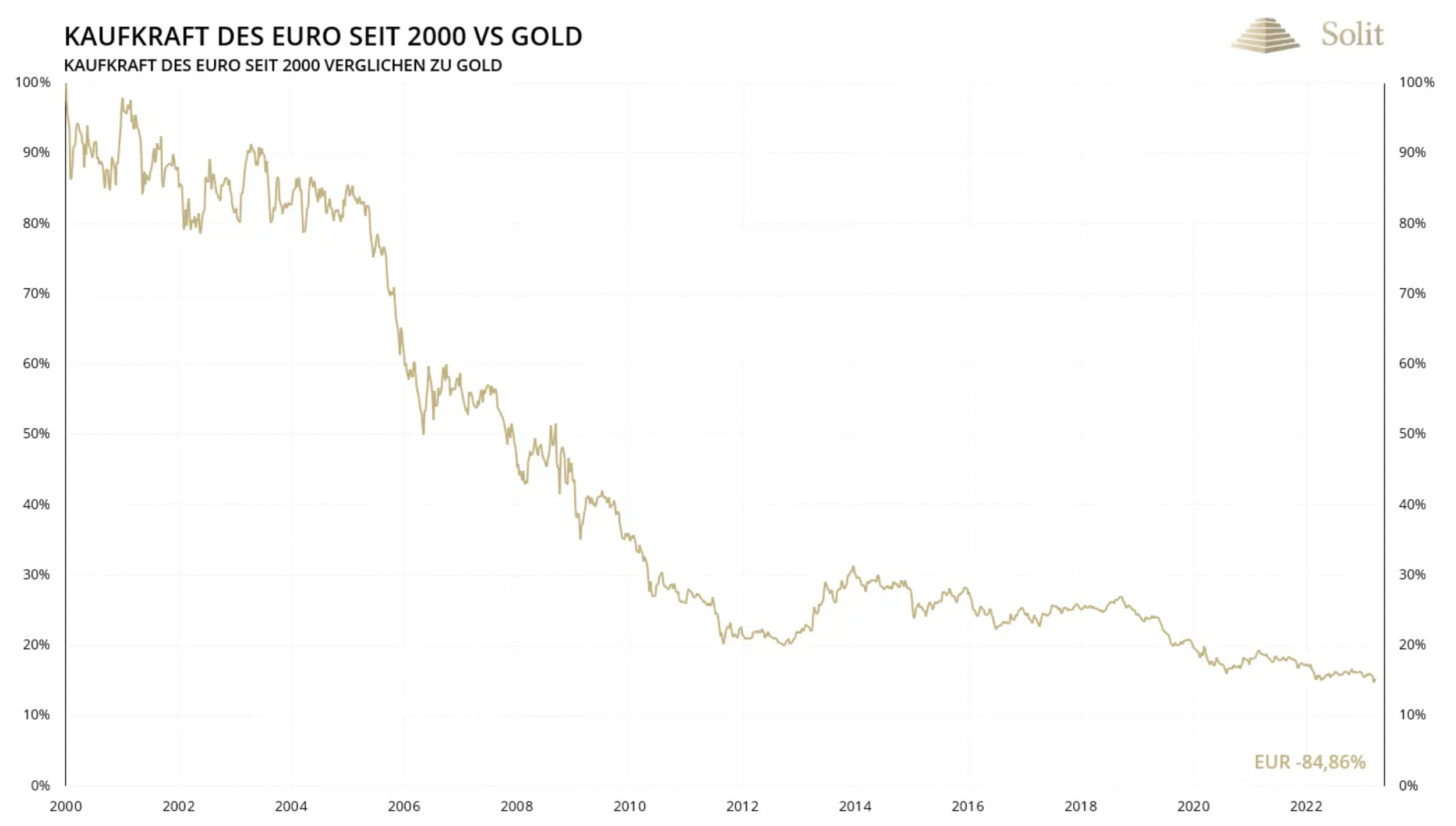 Kaufkraftverlust des Euro im Vergleich zu Gold seit 2000. Quelle: SOLIT GmbH.