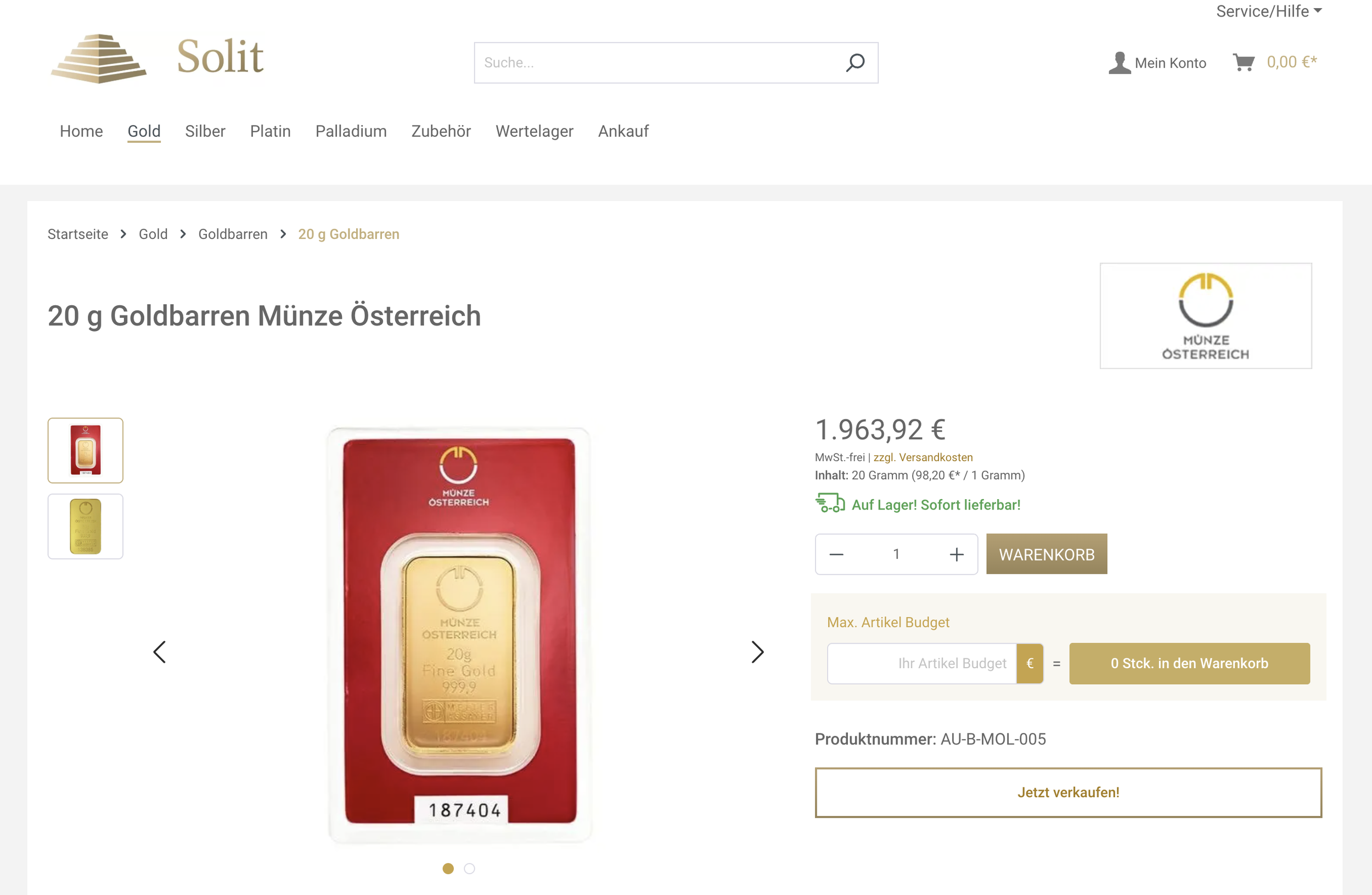 Allerdings: Der Kauf ist teuer. Ein 20g-Goldbarren der Münze Österreich kostet beim Händler SOLIT rund 1.964 €, direkt beim Hersteller hingegen 2.026 € – für denselben Barren!