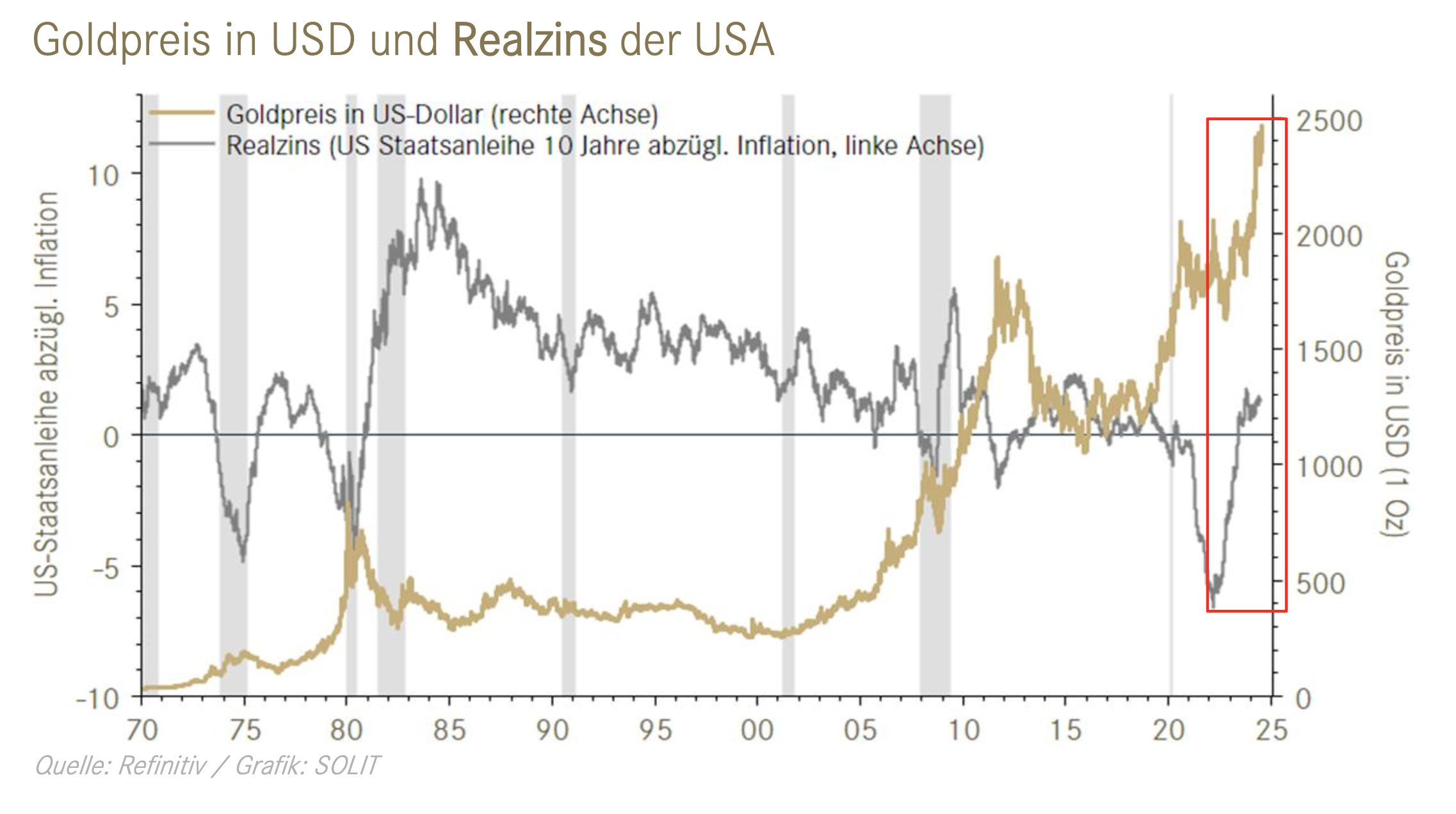 Gold reagiert stark auf den Realzins, also die Differenz zwischen Nominalzins und Inflation. Die US-Notenbank FED plant Zinssenkungen bis 2026 auf 3 %, während die Inflation vielleicht wieder anziehen wird. Gleiches gilt für die Europäische Zentralbank, wo man von einer Zinssenkung auf 2% ausgeht.