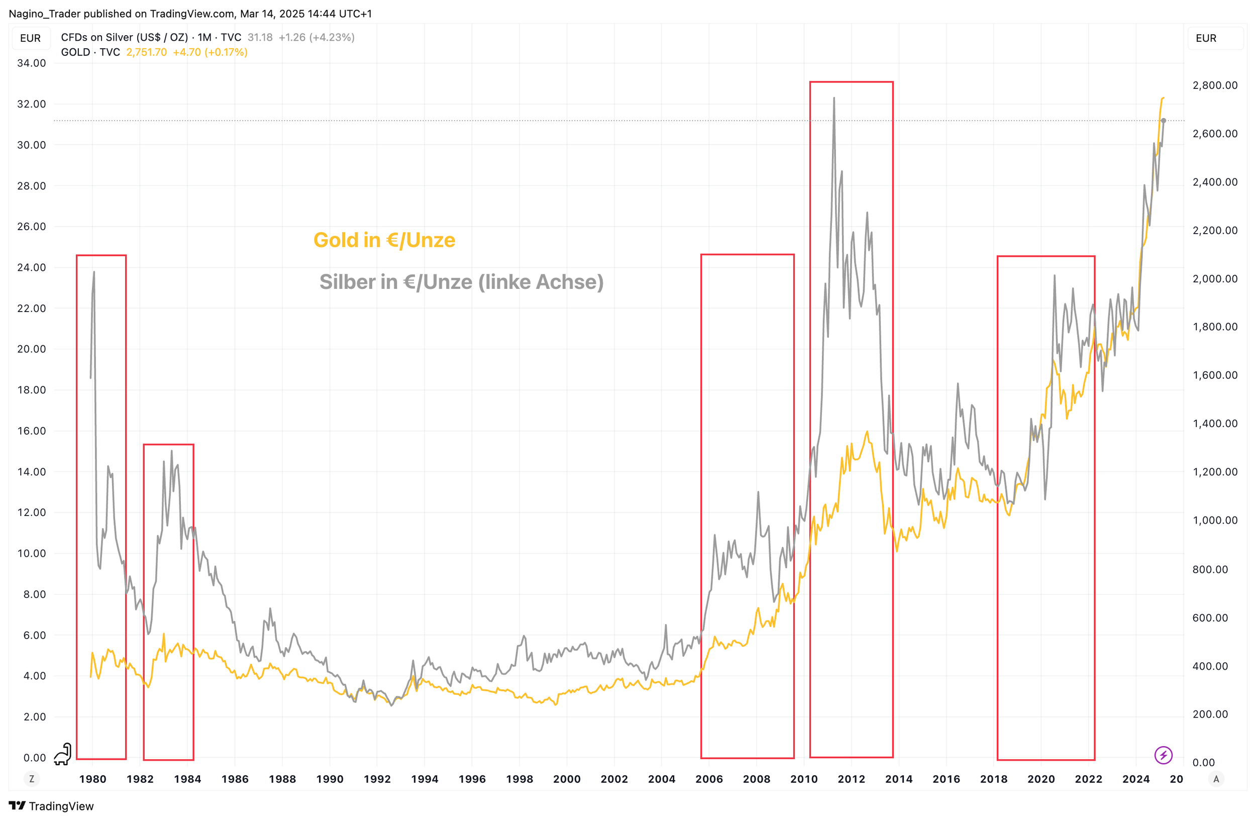 In Phasen starker Wertsteigerungen, übertrifft die Rendite von Silber die von Gold oftmals. Quelle: Tradingview